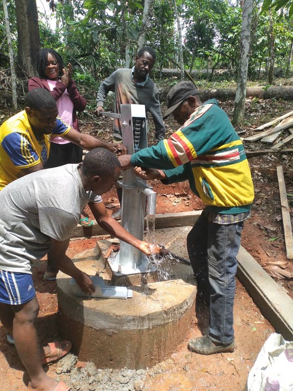 Am 12. März 2024 wurde das Wasserprojekt fertiggestellt. An jenem Tag waren die Techniker von morgen bis abends am Werk. Junge und alte Menschen und alle dynamischen Kräfte haben sich am Vormittag am Festplatz versammelt. Sie sind aus allen Blickwinkeln des Dorfes gekommen. Keiner wollte die historische Veranstaltung des Tages verpassen: Pumpeninstallation. Nach der Ankunft um 10.00 Uhr des Vertreters der Elefantenfüße in Kamerun, Jacques Abel ONYA, haben die Dorfbewohner den Brunnenplatz erobert, um bei der Pumpeninstallation dabei zu sein. Es war der erste Zeitpunkt der Veranstaltung. Alle konnten voller Neugier zuschauen, wie die Techniker die Pumpe sorgfältig zusammenbauen. Nach ungefähr einer Stunde kam der wichtigste Zeitpunkt des Tages: das saubere Trinkwasser kommt aus der Pumpe und fließt majestätisch. Sobald das Wasser sichtbar war, brachen Freudeschreie aus. Die Freude ist unbeschreiblich. Alle singen, tanzen frenetisch und genießen das Wasser. „Wir sind gerettet! Wir sind gerettet! Wir sind gerettet! Denn Wasser heißt Leben!“, lässt das Dorfoberhaupt durchblicken.